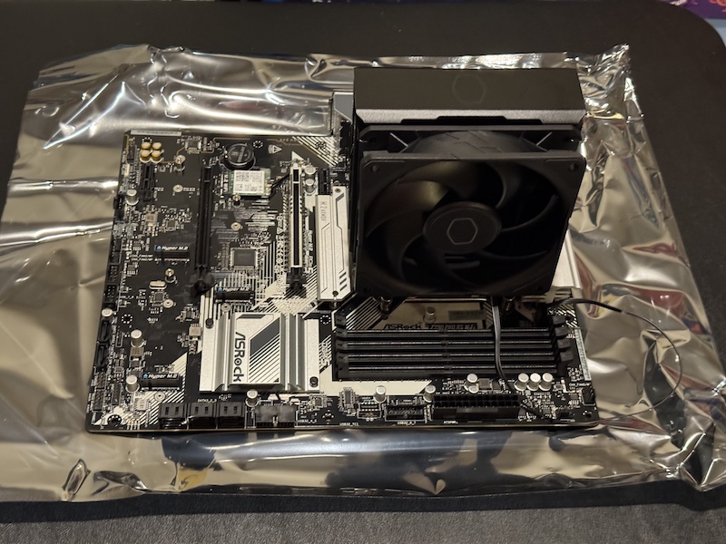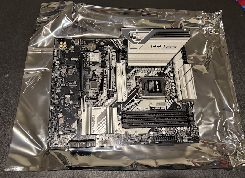 Our goal on Monday August 4th was to install the CPU into the motherboard and the CPU cooler on top of that. This is the motherboard -- an ASRock PRO Z790 PRO RS WiFi. I've used ASRock in the past and been happy with them, and this board had all the right features built-in and solid reviews on NewEgg.