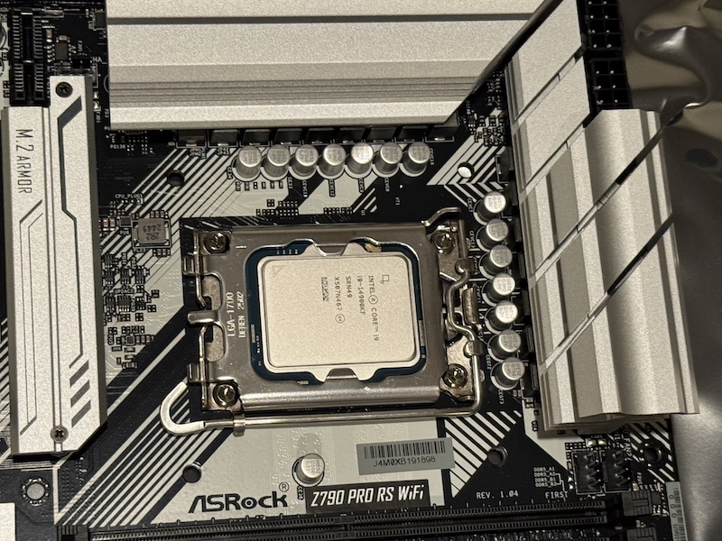 The CPU, an Intel Core i9-14900KF, now installed in its slot. I used the same process I've always used successfully for selecting a CPU -- go to the PassMark CPU benchmarks, start at the top-performing, then go down the list until I find a few CPUs in my price range. It's a great way to find the top-performing CPU that fits into the budget for the build. This is an impressive 24-core i9, which should fit well with this gaming PC.