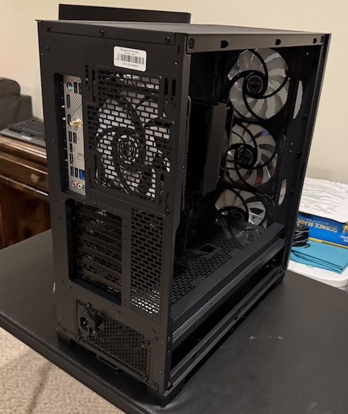 A rear view of the computer in the same state -- you can see the motherboard connector panel and also a nice view of the case fans.
