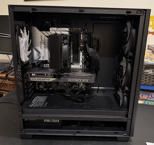After this picture, things didn't go perfectly. As planned, we installed the graphics card, an MSI-built Geforce RTX 5060 Ti card, and then tried an initial boot up. All the case fans and CPU cooler came on, but nothing came on the monitor. To rule out possibilities, we tried the video card in different PCIe slots, different power connectors to the video card, and also installed the M.2 hard drive. Across all these attempts, we couldn't get any video output. So we ended day 2 a little frustrated, but encountering issues like this is part of the challenge and pride of building a PC.